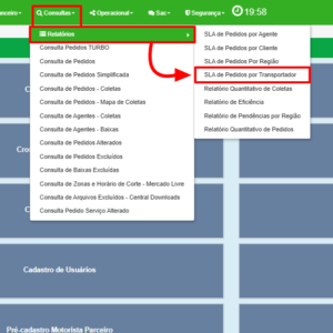 - Na barra superior do menu, vá em Consultas > Relatório > SLA de pedidos por transportador